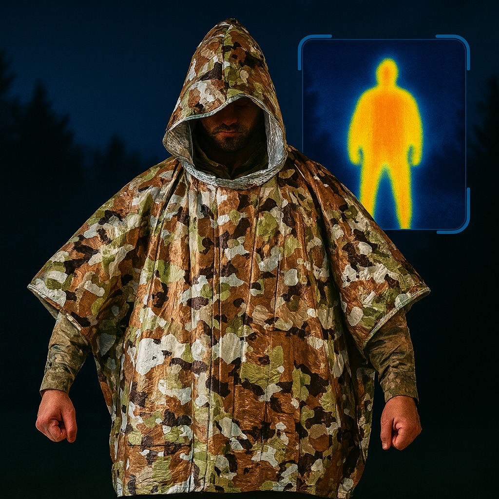 Це термопончо створене для збереження тепла та надійного захисту від опадів і вітру. Міцний матеріал стійкий до розривів, а просторий крій з капюшоном не обмежує рухів. Легке та компактне, завжди готове до використання. Особливість: спеціальна структура тканини блокує теплову сигнатуру тіла, роблячи її непомітною для тепловізорів та зменшуючи ймовірність виявлення комарами.